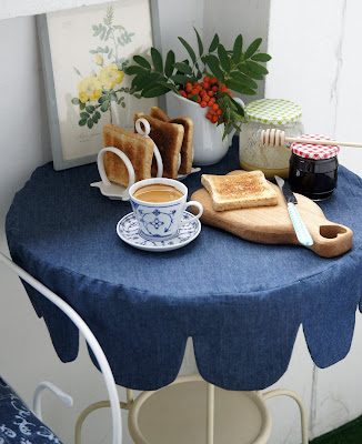 Obrusik na okrągły stolik uszyłam z dżinsowej sukienki, której już nie nosiłam ;)
