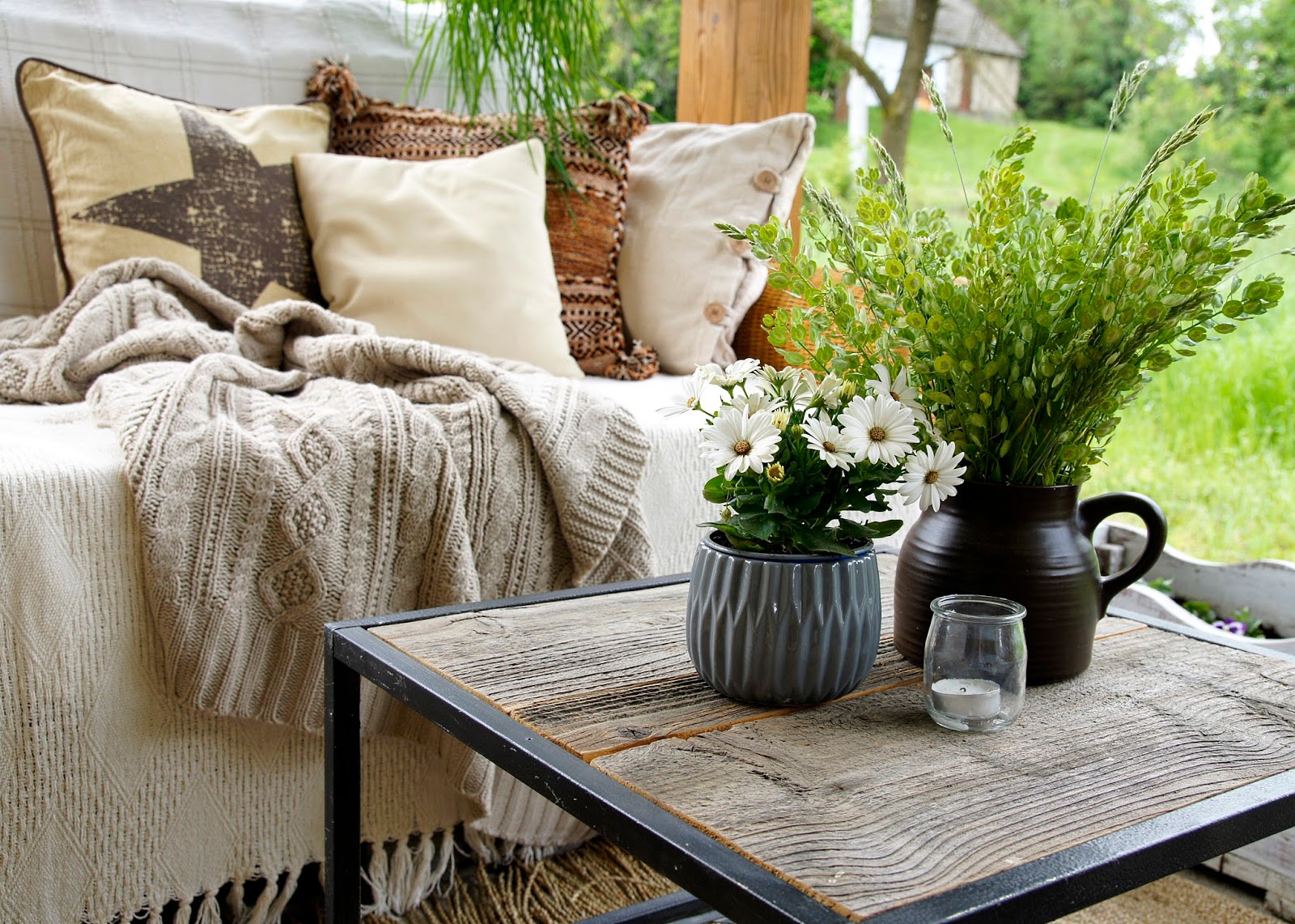 Nowe są tylko dywan z trawy morskiej i lampki, kupione na wyprzedaży w Ikea oraz wełniany pled z Lidla.